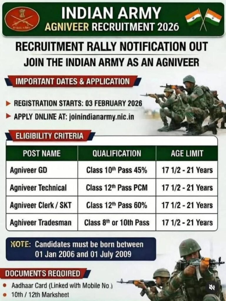 Indian Army Agniveer Rally 2026-27 – ದೇಶ ಸೇವೆಗೆ ಸುವರ್ಣಾವಕಾಶ ದೇಶಕ್ಕಾಗಿ ಸೇವೆ ಸಲ್ಲಿಸುವ ಕನಸು ಹೊಂದಿರುವ ಲಕ್ಷಾಂತರ ಯುವಕರಿಗೆ ಇದೀಗ ದೊಡ್ಡ ಅವಕಾಶ ಲಭಿಸಿದೆ. …